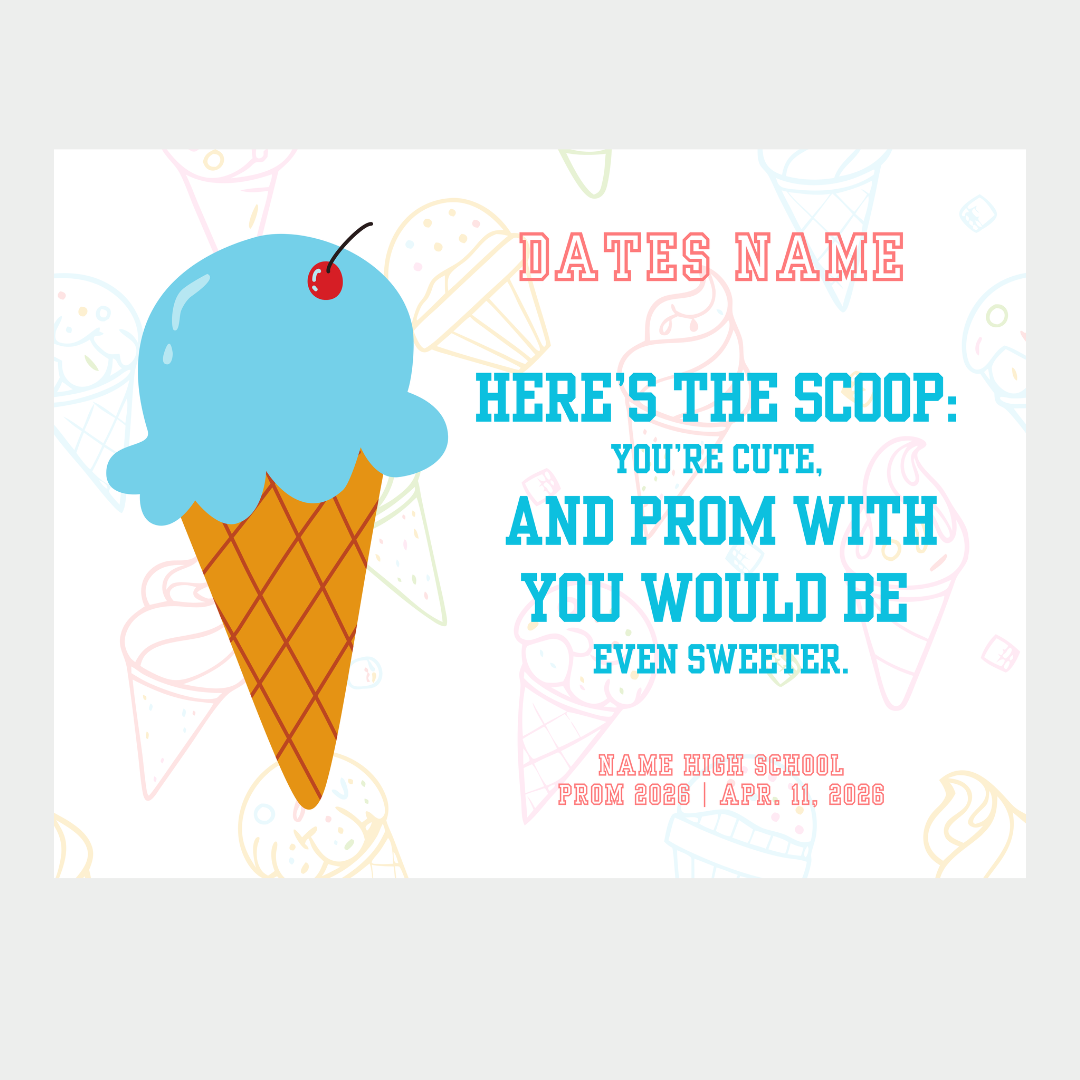 Scoop up the sweetest "YES" with our adorable "Here's The Scoop" custom promposal banner! This 36x48 inch banner features an irresistible blue ice cream cone and the cutest pun that's guaranteed to melt their heart.
