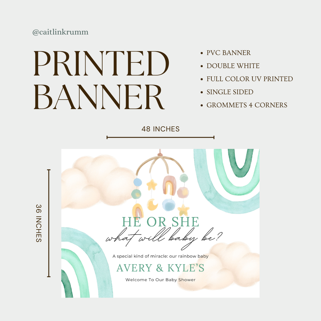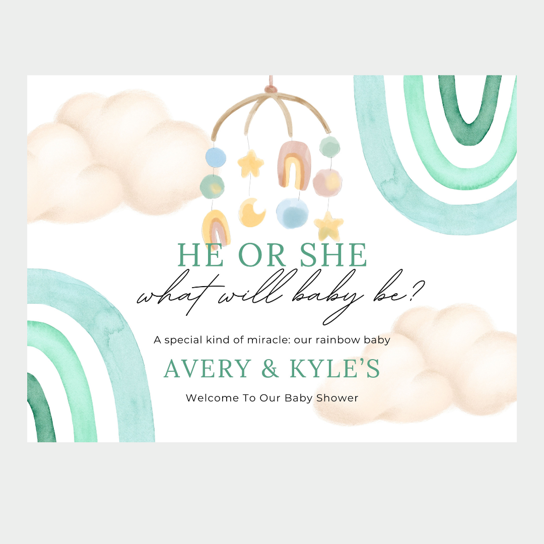 Announce your rainbow baby's gender with this stunning "He or She, What Will Baby Be? A Special Kind of Miracle, Our Rainbow Baby" personalized banner. The soft watercolor rainbow design combined with heartfelt messaging creates the perfect backdrop for revealing whether your miracle baby is a boy or girl, while honoring the profound journey that brought you here.