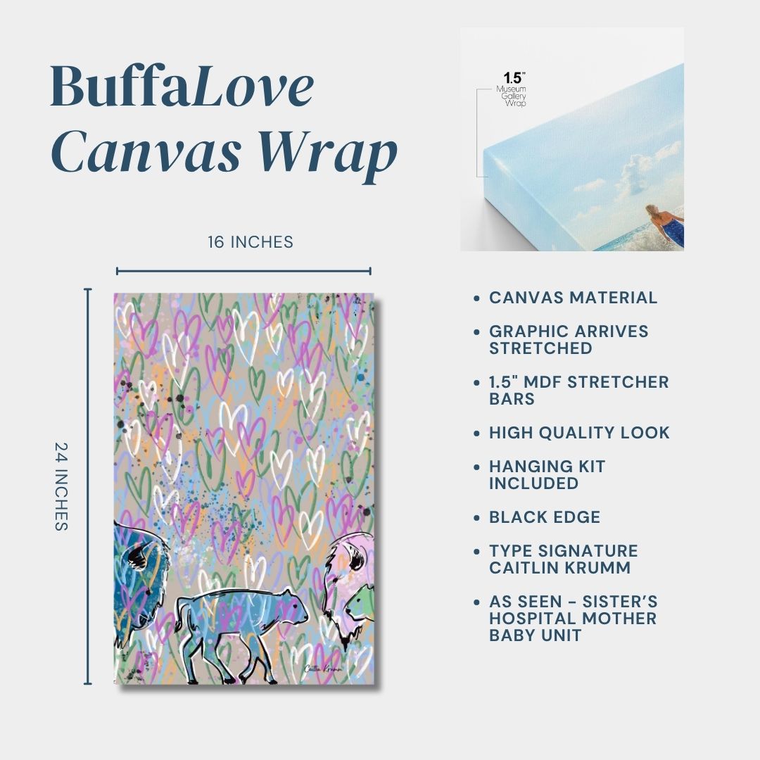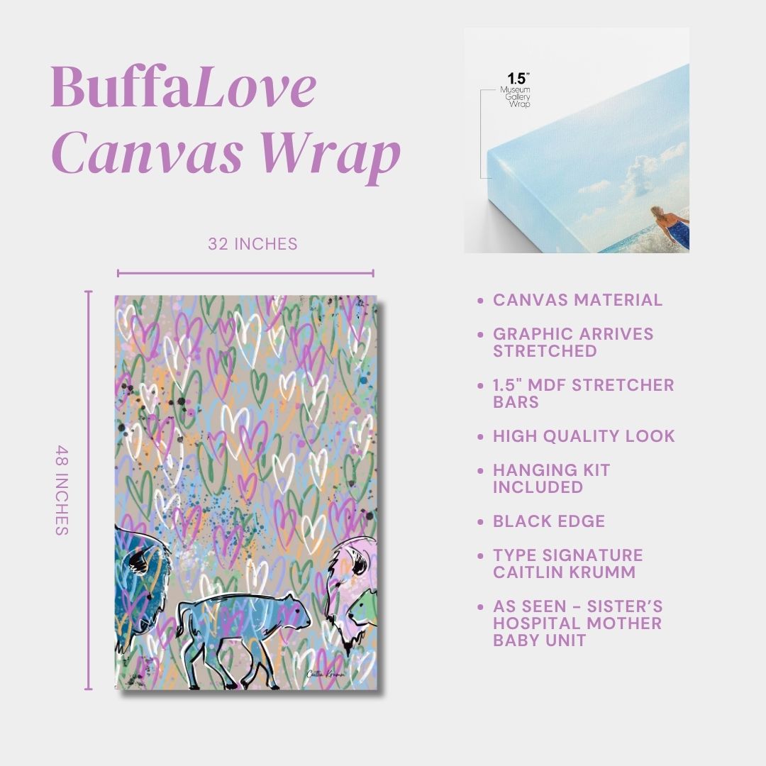 Celebrate family love and Buffalo pride with this heartfelt “Pastel Family” BuffaLove canvas wrap. Inspired by Caitlin Krumm’s own family, this piece features mom and dad buffalo heads gently peeking in on two babies depicted in soothing blue and green tones. The soft pastel purple with a subtle grey undertone palette creates a calm, nurturing vibe that beautifully complements any family or nursery space.