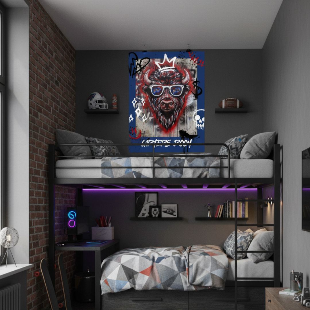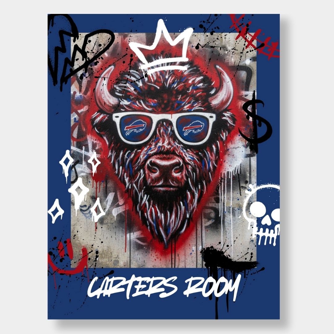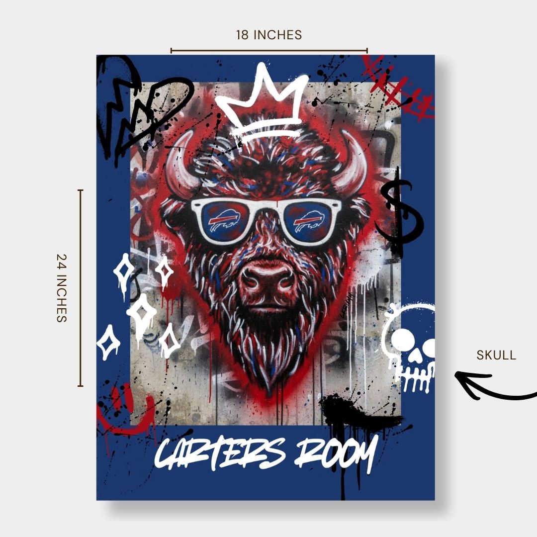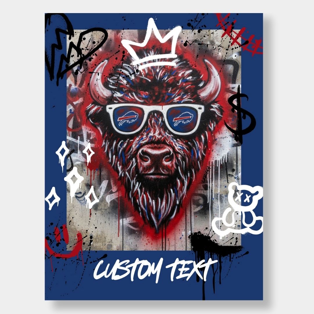 Bring bold Buffalo pride and street-art attitude to your space with this custom 18x24 poster. Featuring an electrifying graffiti-style buffalo head rocking iconic shades, this design blends urban art with team spirit. Personalize it with your own custom text – perfect for man caves, game rooms, or gifting to a diehard fan.