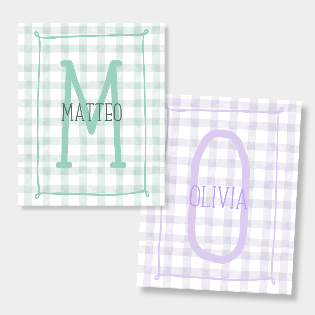 Personalized baby name art in cool-toned pastels for minimalist kids room and playroom deco