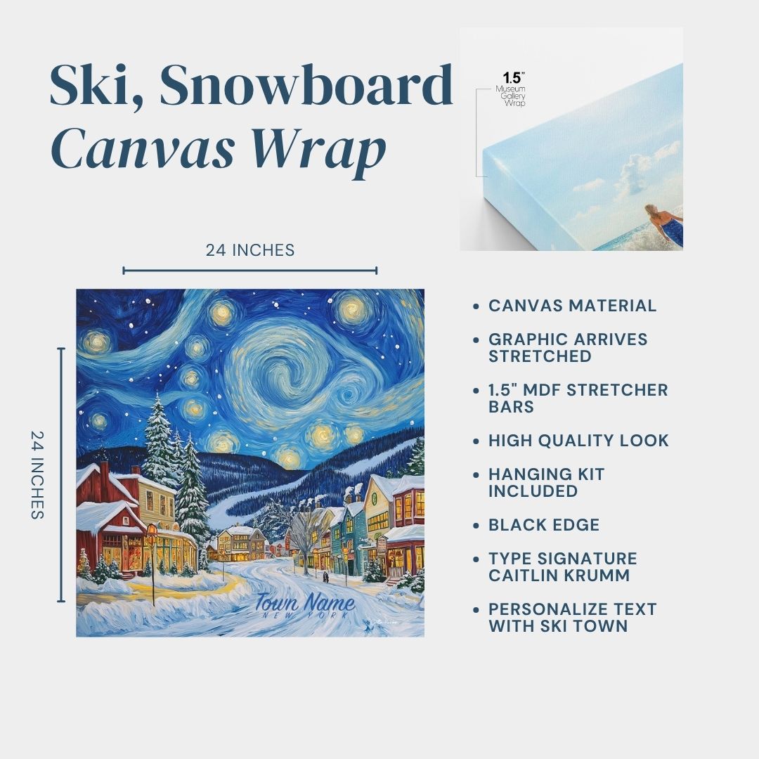 Experience the enchanting magic of Ellicottville, New York, with this captivating winter village canvas art. Inspired by Van Gogh's iconic Starry Night, this stunning piece features a swirling sky filled with golden stars glowing over a charming snow-covered ski village.