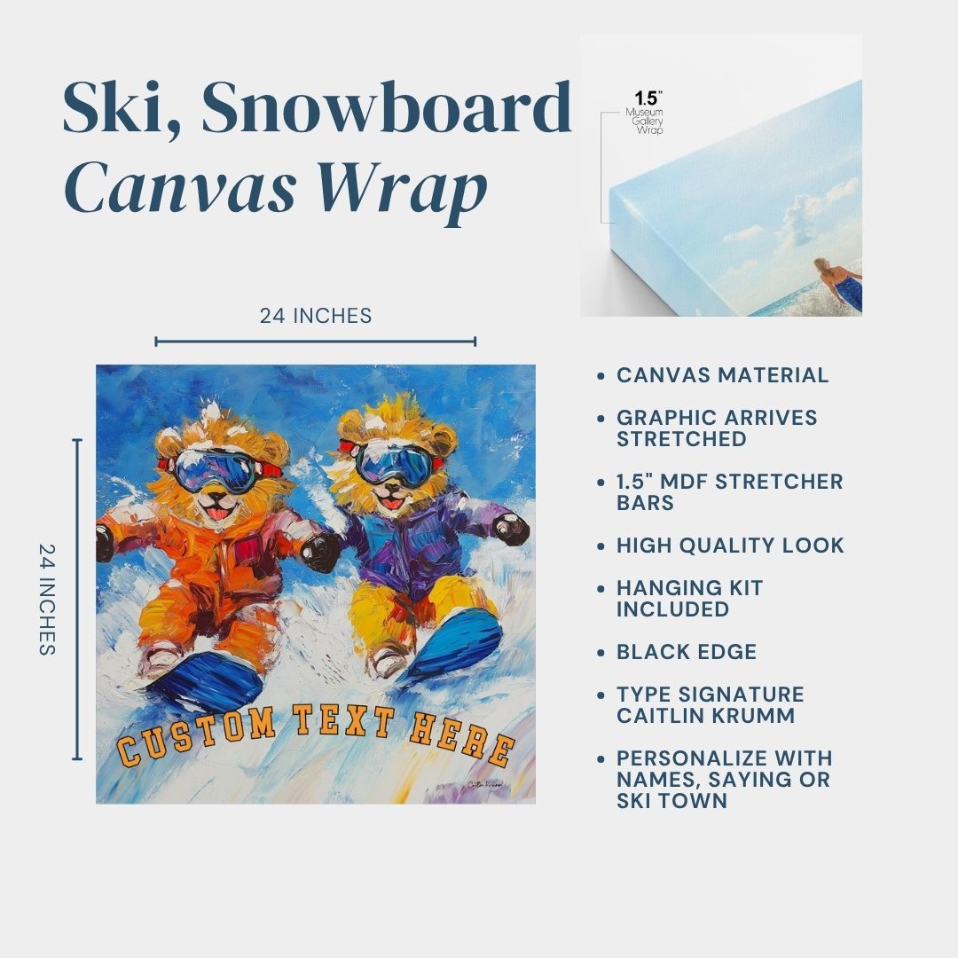 This dynamic piece features two playful lions catching air on the slopes, painted in brilliant blues, oranges, and purples. Customize the text at the bottom to make it uniquely yours—perfect for adding personality and excitement to your mountain cabin, winter lodge, or ski town rental.