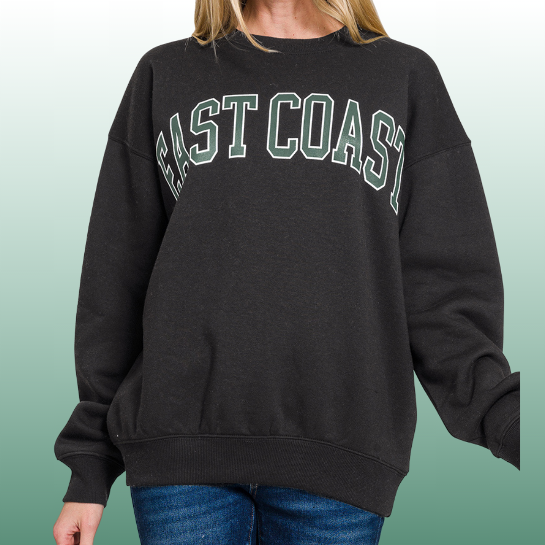This sweatshirt combines comfort with style, making it perfect for everyday wear, weekend outings, or layering. The "East Coast" graphic appeals to coastal lifestyle enthusiasts and anyone who loves casual, statement-making pieces. The cotton-poly blend ensures it stays soft and maintains its shape wash after wash.